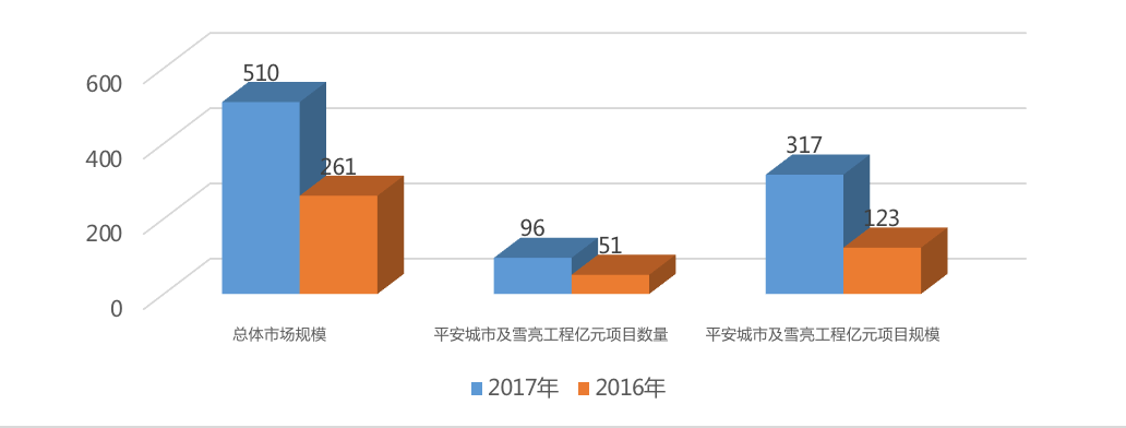 據(jù)金鵬監(jiān)測到的大項目數(shù)據(jù)顯示,截止2017年12月底,我國城市視頻監(jiān)控市場中標的大項目累計有1049個,總市場規(guī)模達510億元,較2016年市場規(guī)模增長95%。其中包含平安城市和雪亮工程在內(nèi)的中標過億元項目有96個,累計市場規(guī)模約317億元;2016年包含平安城市和雪亮工程在內(nèi)的中標過億元項目有51項,累計市場規(guī)模約123億元。2017年項目數(shù)量較2016年增長88%,市場規(guī)模增長158%。其中涉及雪亮工程市場規(guī)模約有的中標億元項目9個,累計市場規(guī)模約32億元。(PS:大項目是指中標金額≧500萬元的項目)
